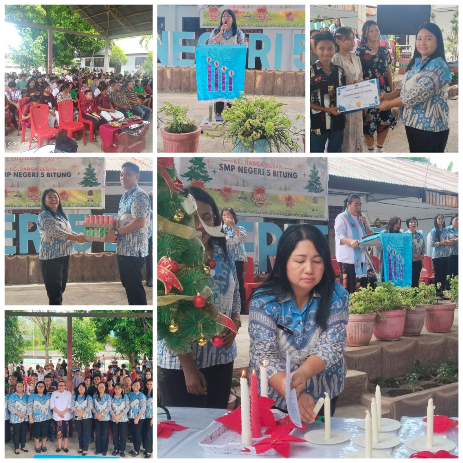 Kegiatan ibadah Natal yang dilaksanakan secara sederhana oleh SMPN 5 Bitung di hadiri oleh Kepala sekolah, guru-guru serta seluruh peserta didik, dan orang tua siswa.